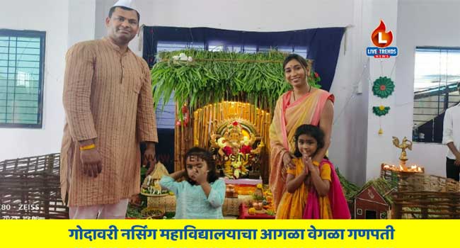 गोदावरी नर्सिंग महाविद्यालयात आज गणपती बाप्पाची स्थापना करण्यात आली असून पाच दिवसांचा गणेशोत्सव येथे साजरा करण्यात येणार आहे. त्या गणेशोत्सवास आज प्रारंभ झाला असून प्रवेशद्वारापासून आपण मंदिरातच जात आहोत अशी सुंदर सजावट विद्यार्थ्यांनी केली आहे. ग्रामीण भागातील संस्कृतीची अभ्यास करत एक एक सर्वच गोष्टी देखाव्यातून दाखविण्यात आल्या आहेत. याप्रसंगी महाविद्यालयातील प्रा.स्वाती गाडेगोने व श्री पंकज (पती) यांच्याहस्ते गणपती बाप्पाची स्थापना करण्यात आली. श्री गणेशाच्या स्थापनेनंतर डॉ.पाटील दाम्पत्यांच्याहस्ते महाआरती करण्यात आली, यावेळी गणपती बाप्पा मोरयाचा गजर करण्यात आला. याप्रसंगी प्राचार्य विशाखा गणवीर, शिवानंद बिरादार, प्रशासकीय अधिकारी प्रवीण कोल्हे, सर्व शिक्षक वृंद व विद्यार्थ उपस्थीत होते. या उपक्रमासाठी प्राचार्यांपासून ते प्राध्यापक, विद्यार्थी वर्गाने मेहनत घेऊन उत्कृष्ठ गणेशोत्सवाचे नियोजन केले आहे.