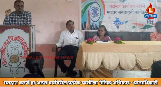 कार्यक्रमात प्रमुख पाहुणे यावल तालुका तहसीलदार मोहनमाला नाझिरकर व निवडणुक निर्णय नायब तहसीलदार रशीद तडवी उपस्थित होते. कार्यक्रमाचे मार्गदर्शक फैजपूरचे प्रांत अधिकारी कैलास कडलग यांनी मतदार नाव नोंदणी व जनजागृती याविषयी मार्गदर्शन करताना म्हणाले की, भारत हा लोकशाही प्रधान देश आहे. भारतातील लोकप्रतिनिधी हे जनतेच्या मतदानातून निवडले जातात, मतदान करणे हे १८वर्षा वरील व्यक्तीचे नैतिक कर्तव्य आहे, असे प्रतिपादन कैलास कडलग यांनी केले.