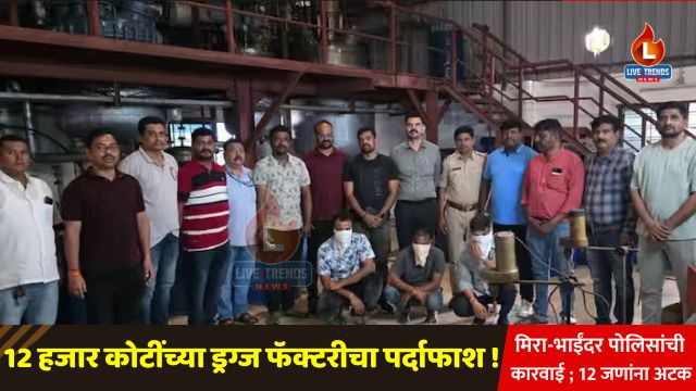 मुंबई-लाईव्ह ट्रेंड्स न्यूज वृत्तसेवा ।  देशात ड्रग्ज विरोधात सुरू असलेल्या मोहिमेला मोठे यश मिळाले असून, मिरा-भाईंदर पोलिसांनी सध्या देशातील सर्वात मोठ्या अमली पदार्थांच्या कारवाईपैकी एक करत तब्बल ₹12,000 कोटींच्या एमडी ड्रग्ज फॅक्टरीचा पर्दाफाश केला आहे. तेलंगणातील चेरापल्ली येथे असलेल्या या गुप्त फॅक्टरीवर पोलिसांनी छापा टाकून 32,000 लिटर कच्चा माल (रॉ मटेरियल) जप्त केला आहे. या प्रकरणात 12 जणांना अटक करण्यात आली असून, त्यात फॅक्टरीचा मालक, केमिकल अॅनालायझर आणि एक परदेशी नागरिकाचा समावेश आहे.
