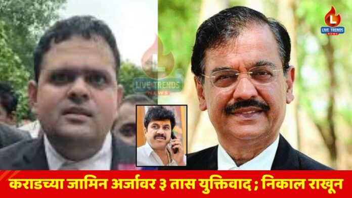 बीड – लाईव्ह ट्रेंड्स न्यूज वृत्तसेवा । मस्साजोगचे सरपंच संतोष देशमुख यांच्या खून प्रकरणातील मुख्य आरोपी वाल्मीक कराडच्या जामिन अर्जावर बीड न्यायालयात आज चुरशीची सुनावणी पार पडली. जवळपास तीन तास रंगलेल्या युक्तिवादात कराडच्या वकिलांनी सुमारे १ तास ४५ मिनिटे युक्तिवाद केला, तर सरकारी वतीने प्रसिद्ध विशेष सरकारी वकील अॅड. उज्ज्वल निकम यांनी प्रभावी युक्तिवाद सादर करत जामिनाला जोरदार विरोध केला. न्यायालयाने दोन्ही बाजू ऐकून घेत निकाल राखून ठेवला असून, पुढील सुनावणी ३० ऑगस्ट रोजी होणार आहे.