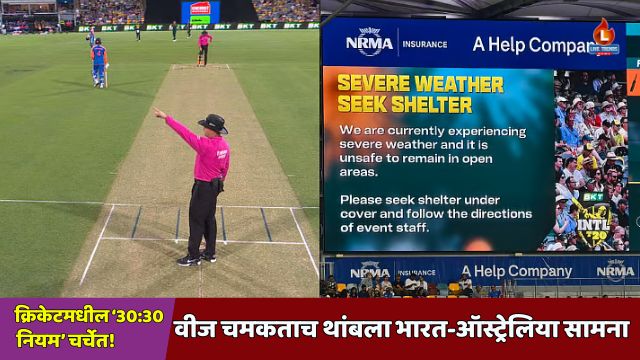 ब्रिस्बेन-लाईव्ह ट्रेंड्स न्यूज वृत्तसेवा । भारत आणि ऑस्ट्रेलिया यांच्यातील पाचवा आणि अखेरचा टी-२० सामना ब्रिस्बेनच्या गाबा स्टेडियमवर खेळवला जात असताना अचानक वीज चमकल्यामुळे खेळ काही काळासाठी थांबवण्यात आला. भारतीय संघाने पहिल्यांदा फलंदाजी करताना ५२ धावा केल्यावर पाचव्या षटकात पंचांनी सामना थांबवला. मैदानावरील स्क्रीनवर “Play Has Been Suspended Due To Lightning” असा संदेश झळकला आणि त्यानंतर पावसालाही सुरुवात झाली. क्रिकेटमध्ये पावसामुळे सामना थांबवला जातो, हे आपण अनेकदा पाहिलं आहे; मात्र वीज चमकल्याने सामना थांबवला जाणं हे क्वचितच घडतं. या घटनेमुळे पुन्हा एकदा ICC च्या ‘30:30 नियम’ाबद्दल क्रीडाप्रेमींमध्ये उत्सुकता निर्माण झाली आहे.