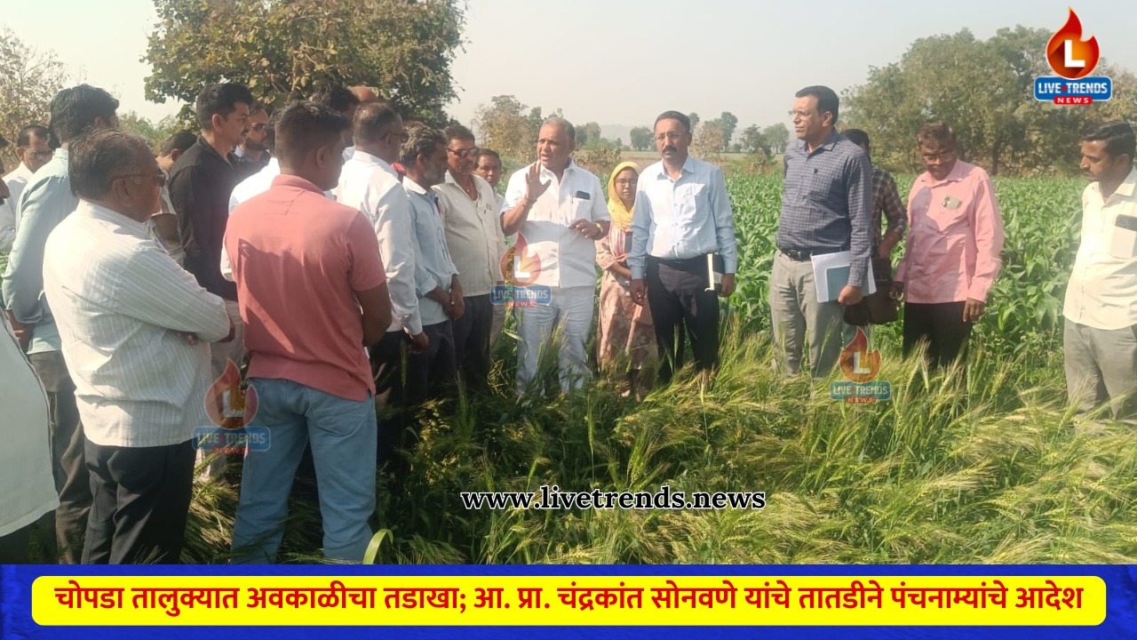 एकूणच, अवकाळी पावसामुळे त्रस्त झालेल्या चोपडा तालुक्यातील शेतकऱ्यांना दिलासा देण्यासाठी लोकप्रतिनिधी व प्रशासनाने तातडीने पावले उचलली असून, पंचनाम्यांनंतर शासकीय मदतीची प्रक्रिया वेगाने राबवली जाण्याची अपेक्षा व्यक्त केली जात आहे.