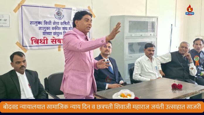 बोदवड-लाईव्ह ट्रेंड्स न्यूज प्रतिनिधी । येथील दिवाणी व फौजदारी न्यायालयात जागतिक सामाजिक न्याय दिन आणि शिवजयंतीनिमित्त आयोजित विशेष कार्यक्रम उत्साहपूर्ण वातावरणात पार पडला. या कार्यक्रमाच्या माध्यमातून न्याय, समता आणि स्वराज्याचा संदेश देत सामाजिक न्यायाचे महत्त्व अधोरेखित करण्यात आले. न्यायालयीन अधिकारी, वकील, कर्मचारी आणि नागरिकांच्या उपस्थितीत झालेल्या या कार्यक्रमाने न्यायव्यवस्थेच्या सामाजिक बांधिलकीची जाणीव करून दिली.