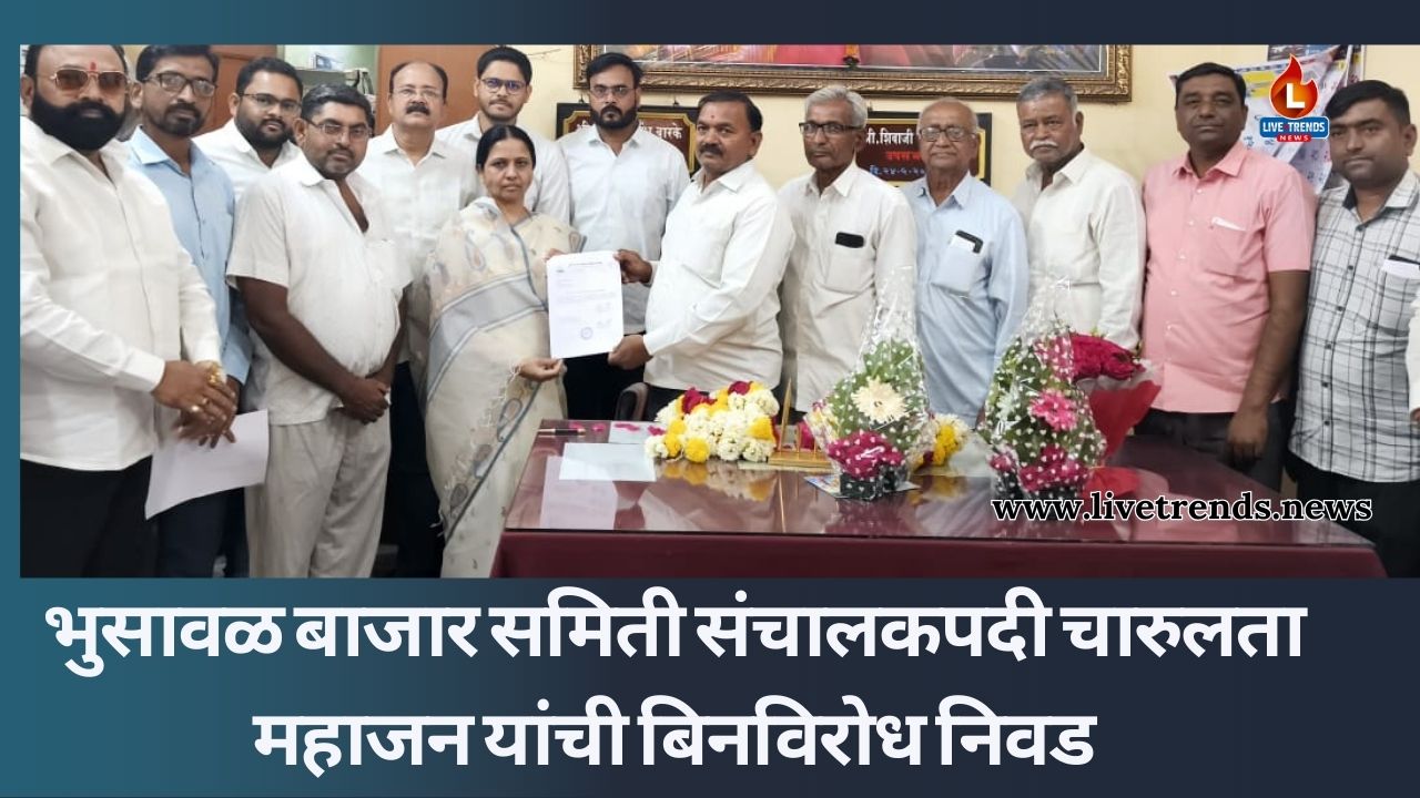 भुसावळ-लाईव्ह ट्रेंड्स न्यूज प्रतिनिधी । भुसावळ कृषी उत्पन्न बाजार समितीच्या संचालकपदी चारुलता कैलास महाजन यांची बिनविरोध निवड करण्यात आली असून त्यांच्या नियुक्तीमुळे स्थानिक राजकीय व सामाजिक क्षेत्रात समाधान व्यक्त करण्यात येत आहे. दिवंगत कैलास श्यामराव महाजन यांच्या निधनानंतर रिक्त झालेल्या जागेवर ही नियुक्ती करण्यात आली आहे.