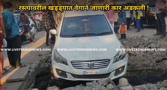जळगाव-लाईव्ह ट्रेंडस न्यूज प्रतिनिधी । जळगाव शहरातील चित्रा चौकात असलेल्या मथुथ फायनान्स कार्यालयासमोर असलेल्या रस्त्यावरील खड्ड्यात भरधाव कार अडकल्याची घटना रविवार २४ मार्च रोजी सायंकाळी ५.३० वाजता घडली आहे. यात सुदैवाने कुणालाही दुखापत झालेली नाही. याबाबत पोलिसात कोणतीही नोंद करण्यात आलेली नाही.