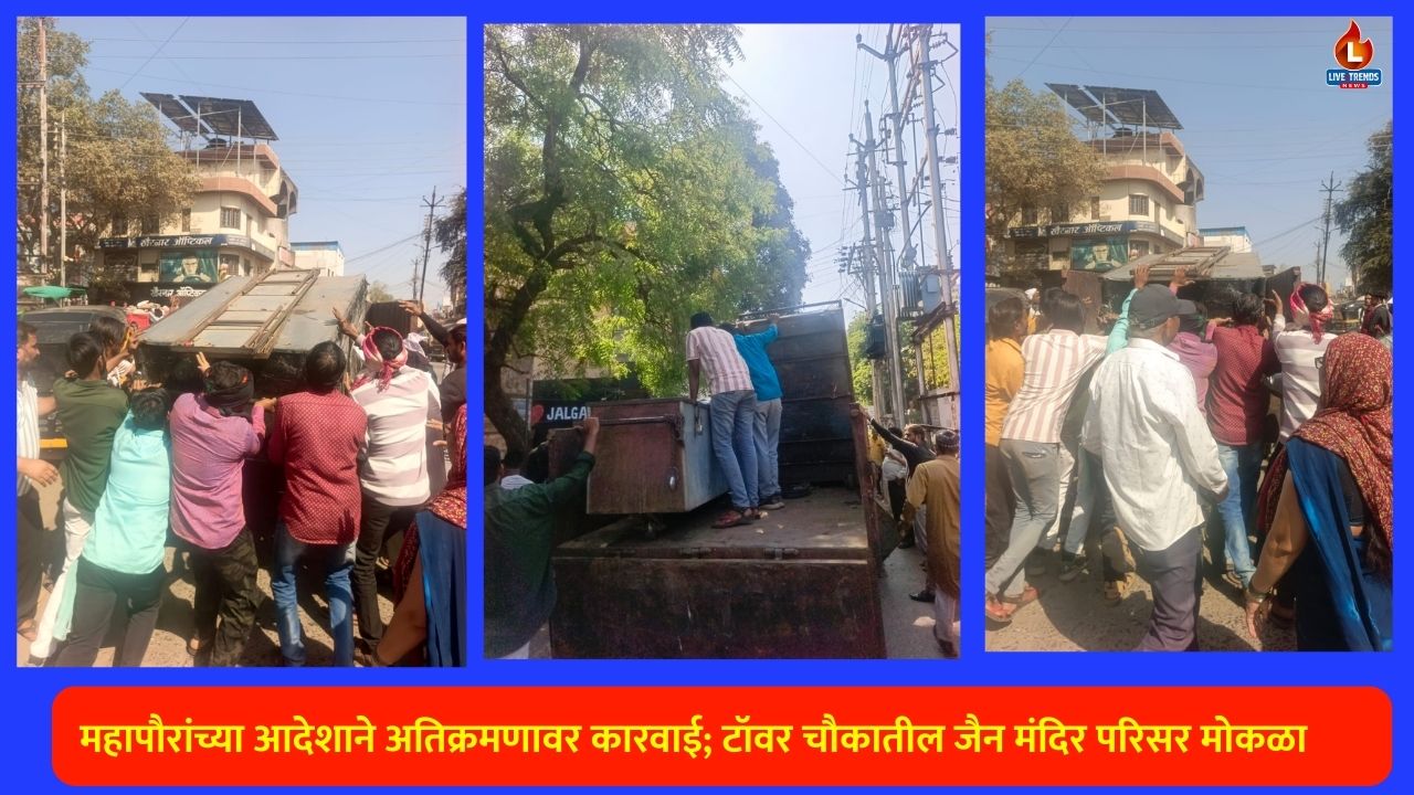 जळगाव-लाईव्ह ट्रेंड्स न्यूज प्रतिनिधी । शहराच्या मध्यवर्ती भागातील टॉवर चौक परिसरात असलेल्या श्री जैन श्वेतांबर मूर्तीपूजक मंदिरासमोरील अतिक्रमणावर अखेर महापालिकेने कारवाई करत ते हटवले. महापौर दीपमाला काळे यांनी या प्रकरणात आक्रमक भूमिका घेत अतिक्रमण विभागाला तात्काळ कारवाईचे आदेश दिल्यानंतर शुक्रवारी ही धडक मोहीम राबवण्यात आली. या कारवाईमुळे मंदिर परिसरातील रस्ता मोकळा झाला असून मंदिर बांधकामासाठी होणारा अडथळा दूर झाला आहे.