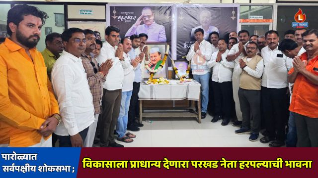 पारोळा-लाईव्ह ट्रेंड्स न्यूज प्रतिनिधी । उपमुख्यमंत्री अजितदादा पवार यांच्या अपघाती निधनाच्या पार्श्वभूमीवर पारोळा शहरात शनिवारी सर्वपक्षीय शोकसभेचे आयोजन करण्यात आले. शहरातील कृषी उत्पन्न बाजार समिती परिसरात पार पडलेल्या या सभेत राजकीय मतभेद विसरून सर्व स्तरांतील नागरिक, पदाधिकारी आणि कार्यकर्ते एकत्र आले होते. राज्याने विकासाला प्राधान्य देणारा, परखड आणि कर्तबगार नेता गमावल्याची तीव्र भावना यावेळी व्यक्त करण्यात आली.