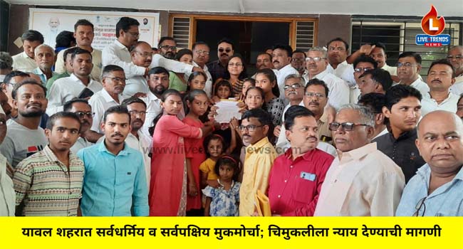 यावल-लाईव्ह ट्रेंडस न्यूज प्रतिनिधी । गोंडगावातील अल्पवयीन मुलीवर अत्याचार करून खून केल्याच्या निषेधार्थ यावल शहरातील सर्वधर्मीय व सर्वपक्षिय मुक मोर्चा काढण्यात आला. अटकेतील संशयित आरोपीला न्यायालयाने कठोरात कठोर कारवाई करावी अश्या मागणीचे निवेदन देण्यात आले.
