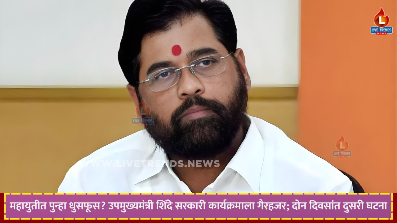 मुंबई–लाईव्ह ट्रेंड्स न्यूज वृत्तसेवा । महाराष्ट्राच्या महायुती सरकारमध्ये सर्व काही सुरळीत असल्याचा दावा करण्यात येत असला, तरी सलग दोन दिवस घडलेल्या घटनांनी सत्ताधारी आघाडीतली दुफळी पुन्हा एकदा ठळकपणे समोर आली आहे. उपमुख्यमंत्री एकनाथ शिंदे यांनी आज महत्त्वाच्या सरकारी कार्यक्रमाला गैरहजेरी लावल्याने राजकीय वर्तुळात चर्चांना उधाण आले आहे. मुख्यमंत्री देवेंद्र फडणवीस आणि उपमुख्यमंत्री अजित पवार मंचावर एकत्र दिसले, मात्र शिंदे यांची अनुपस्थिती अनेक प्रश्न निर्माण करणारी ठरली.