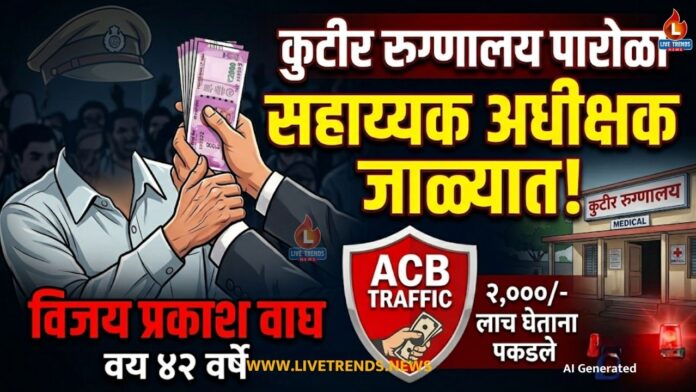 जळगाव/पारोळा- लाईव्ह ट्रेंड्स न्यूज प्रतिनिधी । पारोळा येथील कुटीर रुग्णालयात कार्यरत असलेल्या सहाय्यक अधीक्षकाला लाच घेताना लाचलुचपत प्रतिबंधक विभागाने (ACB) रंगेहात पकडले आहे. स्थायी आदेश (Permanent Appointment Order) देण्यासाठी ३ हजार रुपयांची मागणी करून, तडजोडीअंती २ हजार रुपये स्वीकारताना संबंधित अधिकाऱ्याला एसीबीने पकडले. या कारवाईमुळे आरोग्य विभागात मोठी खळबळ उडाली आहे.