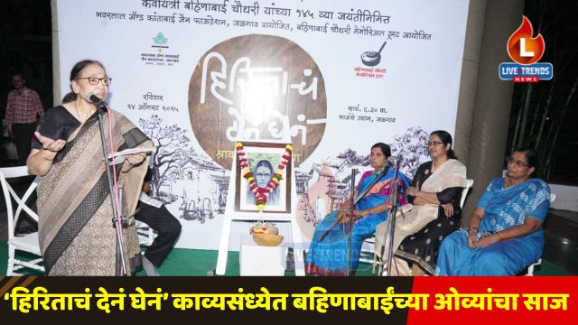 बहिणाबाई चौधरी मेमोरियल ट्रस्ट आणि भवरलाल अॅण्ड कांताबाई जैन फाऊंडेशन यांच्या संयुक्त विद्यमाने भाऊंचे उद्यान येथे ‘हिरिताचं देनं घेनं’ या श्रावण काव्यसंध्येचे आयोजन करण्यात आले होते. निसर्गकन्या बहिणाबाईंच्या कविता हे कार्यक्रमाचे केंद्रबिंदू ठरल्या. त्यांच्या ओव्यांतून ग्रामीण जीवन, स्त्रियांचे अंतरंग, श्रमजीवी जीवनशैली आणि निसर्गाशी असलेली नाळ याचे सुरेख दर्शन घडले.