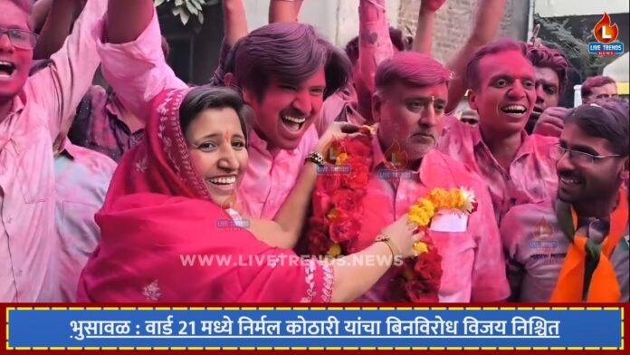 भुसावळ-लाईव्ह ट्रेंड्स न्यूज प्रतिनिधी । भुसावळ नगरपरिषद निवडणुकीत माघारीच्या अखेरच्या दिवशी वार्ड क्रमांक 21 मध्ये मोठी राजकीय घडामोड घडली असून, सर्व उमेदवारांनी अर्ज मागे घेतल्याने निर्मल ऊर्फ पिंटू कोठारी यांचा बिनविरोध विजय निश्चित झाला आहे. या अनपेक्षित बदलामुळे वार्ड 21 मध्ये निवडणूक प्रक्रिया औपचारिक ठरली आहे.