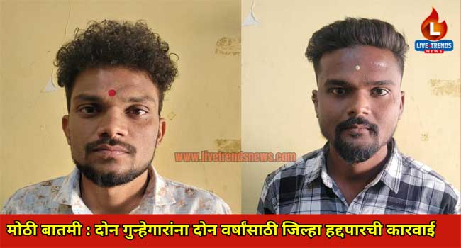 जळगाव-लाईव्ह ट्रेंड्स न्युज प्रतिनिधी । खून, खुनाचा प्रयत्न, दरोडा, जबरी चोरी यासह १३ गंभीर गुन्हे दाखल असलेल्या आकाश उर्फ डोया मुरलीधर सपकाळे (वय- २३) व गणेश उर्फ काल्या रवींद्र सोनवणे (वय- २०), रा. कांचननगर यांना जिल्ह्यातून दोन वर्षांसाठी हद्दपार करण्यात आले आहे. तसे आदेश पोलिस अधीक्षक एम. राजकुमार यांनी काढले आहे, अशी माहिती स्थानिक गुन्हे शाखेचे वरिष्ठ पोलीस निरीक्षक किसननजन पाटील यांनी दिली.