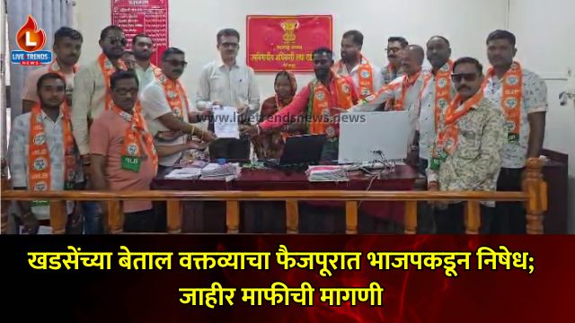 फैजपूर-लाईव्ह ट्रेंडस न्यूज प्रतिनिधी । मंत्री गिरीश महाजन यांच्या विरोधात आमदार एकनाथ खडसे यांनी केलेल्या कथित अश्लील आणि अपमानास्पद वक्तव्याचा फैजपूर शहर भारतीय जनता पार्टीच्या (भाजप) कार्यकर्त्यांनी तीव्र निषेध केला आहे. कार्यकर्त्यांनी घोषणाबाजी करत फैजपूरच्या प्रांत अधिकाऱ्यांना याबाबत निवेदन सादर केले.