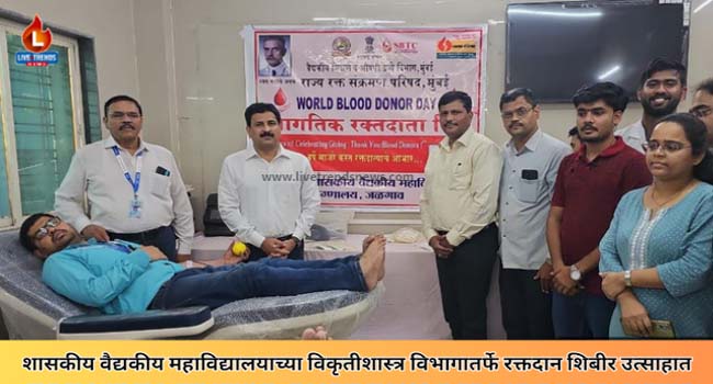 जळगाव – लाईव्ह ट्रेंड्स न्यूज प्रतिनिधी | जागतिक रक्तदाता दिनानिमीत्त शासकीय वैद्यकीय महाविद्यालय व रुग्णालयाच्या विकृतीशास्त्र (पॅथॉलॉजी) विभागातर्फे विद्यार्थ्यांसह प्राध्यापक, डॉक्टरांनी शुक्रवारी १४ जून रोजी दुपारी रक्तदान केले. शिबीरात ४० पिशव्यांचे रक्तसंकलन करण्यात आले.