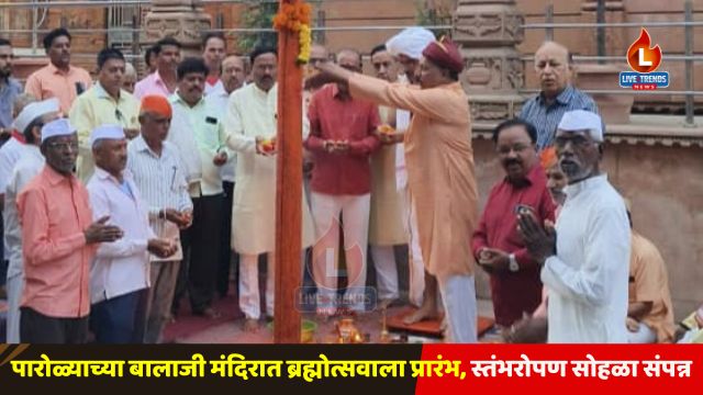 पारोळा-लाईव्ह ट्रेंडस न्यूज प्रतिनिधी । पारोळ्याचे आराध्य दैवत असलेल्या बालाजी मंदिरात आजपासून १९ सप्टेंबर ब्रह्मोत्सवाला मोठ्या उत्साहात सुरुवात झाली आहे. सकाळी ६ वाजून ११ मिनिटांनी मंदिराच्या प्रांगणात विधिवत स्तंभरोपण करून या सोहळ्याचा शुभारंभ करण्यात आला. या पूजेने उत्सवाचा प्रारंभ झाला असून, पुढील काही दिवस धार्मिक कार्यक्रम आणि भक्तांच्या उपस्थितीने मंदिर परिसर गजबजून जाणार आहे.