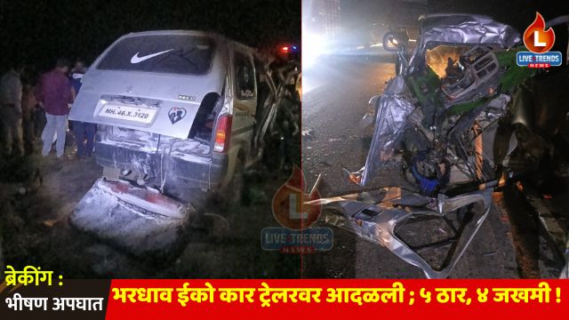 मुक्ताईनगर-लाईव्ह ट्रेंडस न्यूज प्रतिनिधी । मुक्ताईनगरकडून मलकापूरकडे जाणाऱ्या महामार्गावर एक भीषण अपघात झाला. भरधाव वेगात असलेल्या मारुती ईको कारने (क्रमांक MH 46 X 3120) एका अज्ञात ट्रेलरला पाठीमागून जोरदार धडक दिली. ही बुधवारी, १७ सप्टेंबर रोजी रात्री ११:१५ वाजण्याच्या सुमारास घडली. या अपघातात एकूण पाच जणांचा जागीच मृत्यू झाला असून, ४ जण गंभीर जखमी झाले आहेत. जखमींना जळगावातील खासगी रूग्णालयात दाखल करण्यात आले आहे. याप्रकरणी मलकापूर एमआयडीसी पोलीस ठाण्यात गुन्हा दाखल करण्यात आला आहे.