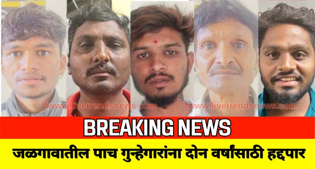 जळगाव जिल्ह्यात टोळीने करणाऱ्यांची संख्या वाढली आहे. यातच जळगाव शहरातील कांचन नगरात राहणारे टोळीप्रमुख हितेश संतोष शिंदे (वय-२५), टोळी सदस्य संतोष उर्फ जागो रमेश शिंदे (वय-४५), आकाश उर्फ नाकतोड्या संजय मराठे (वय-२२), सुमित उर्फ गोल्या संजय मराठे (वय-२७) आणि संजय देवचंद मराठी (वय-५०) सर्व रा. चौगुले प्लॉट, कांचन नगर, जळगाव हे खून प्रयत्न करणे, जबरी चोरी, दंगल, घातक हत्यार बाळगणे, मारामारी, शिवीगाळ, दमदाटी तसेच पोलिसांच्या आदेशाची उल्लंघन करणे या स्वरूपाचे वेगवेगळे ७ गंभीर स्वरूपाचे गुन्हे दाखल आहे. या अनुषंगाने या टोळीला हद्दपार करण्याबाबत शनिपेठ पोलीस ठाण्याचे पोलीस निरीक्षक रंगनाथ धारबळे यांनी हद्दपार करण्याचा प्रस्ताव प्रस्ताव उपविभागीय पोलीस अधिकारी संदीप गावित यांना पाठवला. त्यानुसार त्यांनी प्रस्तावाचे अवलोकन करत हद्दपारिला मंजूर देण्यासाठी पोलीस अधीक्षक एम. राजकुमार यांच्याकडे पाठवला. दरम्यान जिल्हा पोलीस अधीक्षक यांनी शुक्रवारी १ डिसेंबर रोजी सायंकाळी ७ वाजता हद्दपार करण्याचे आदेशाला मंजुरी दिली. दरम्यान या पाचही जणांना २ वर्षांकरिता जिल्हा हद्दपार करण्याचे आदेश काढले आहे.