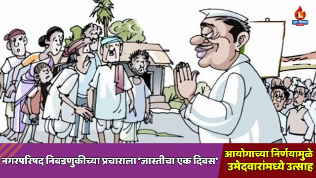 मुंबई -लाईव्ह ट्रेंड्स न्यूज वृत्तसेवा। राज्यात सुरू असलेल्या नगरपालिका आणि नगरपंचायतींच्या निवडणुकांच्या तुफानी प्रचाराला आता आणखी वेग मिळणार आहे. राज्य निवडणूक आयोगाने प्रचाराच्या मुदतीत वाढ करण्याचा निर्णय घेतल्याने उमेदवारांसह सर्वच पक्षांच्या कार्यकर्त्यांना दिलासा मिळाला आहे. वाढीव वेळेमुळे संघटनांना रणनीती आखण्याची आणि अधिकाधिक मतदारांपर्यंत पोहोचण्याची संधी मिळणार आहे.