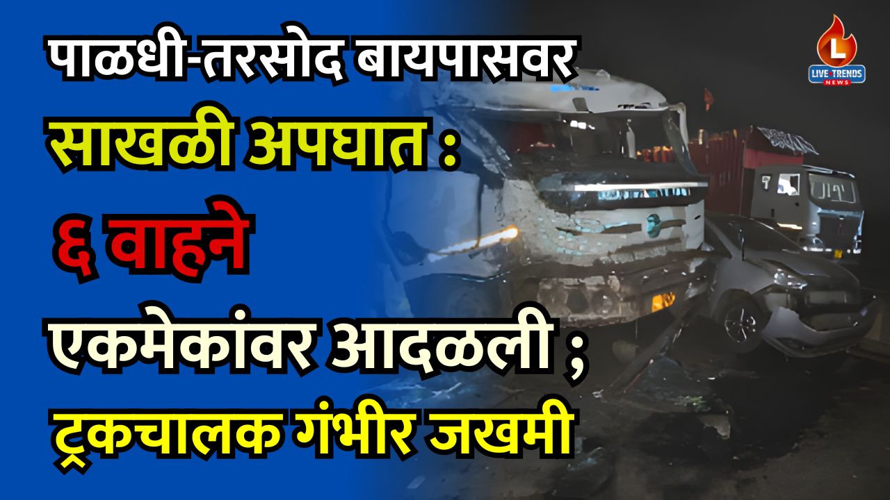 जळगाव-लाईव्ह ट्रेंड्स न्यूज प्रतिनिधी । जळगाव शहरालगतच्या पाळधी-तरसोद नवीन बायपास महामार्गावर गिरणा नदी पुलाजवळ रात्री उशिरा भीषण साखळी अपघात घडला. काचेच्या बाटल्या घेऊन जाणारा कंटेनर अचानक कलंडल्याने रस्त्यावर मोठ्या प्रमाणात बाटल्यांचे बॉक्स विखुरले आणि मागून येणारी सहा वाहने एकमेकांवर धडकली. या अपघातात सहा वाहनांचे मोठे नुकसान झाले असून एक ट्रकचालक गंभीर जखमी झाला आहे.