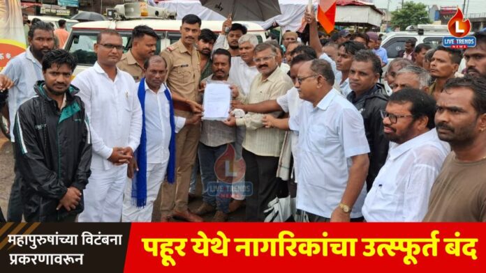 पहूर (ता. जामनेर) – लाईव्ह ट्रेंड्स न्यूज प्रतिनिधी । शेंदुर्णी येथे डॉ. बाबासाहेब आंबेडकर यांच्या पुतळ्याची विटंबना झाल्याच्या संतप्त प्रतिक्रिया उमटत असतानाच, पहूर शहरात आज (ता. १८ ऑगस्ट) नागरिकांनी एकत्र येत पूर्ण बंद पाळला. संविधान निर्माते बाबासाहेबांविषयी असलेल्या आदरभावनेतून आणि या कृत्याचा तीव्र निषेध करण्यासाठी व्यावसायिकांनीही आपले व्यवहार बंद ठेवत सहभागी होण्याची जबाबदारी घेतली.