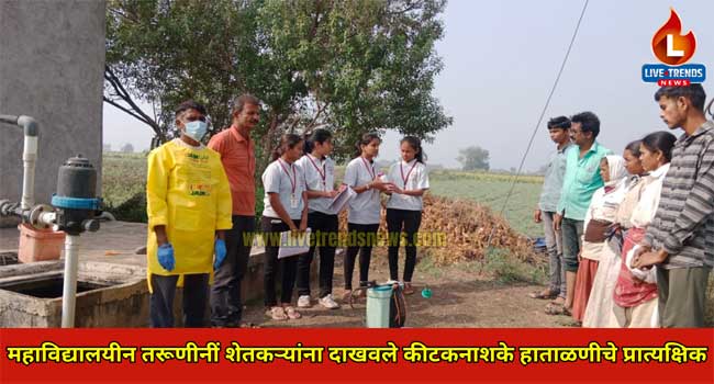 साकेगाव-लाईव्ह ट्रेंडस न्यूज प्रतिनिधी | ग्रामीण कृषी जागरुकता आणि कृषी औद्योगिक कार्यक्रम 2023-24 अंतर्गत कृषी महाविद्यालय, मुक्ताईनगर येथील विदयार्थींनी मिनाज शेख, चैताली कुऱ्हे, वैष्णवी पालवे व तनुजा पाटील यांनी साकेगाव मधील शेतकऱ्यांना कीटकनाशके, बुरशीनाशके आणि तणनाशके हाताळणीचे प्रात्यक्षिक करून त्यांना वेगवेगळ्या किडींचा, रोगांचा व तणांचा प्रादुर्भाव रोखण्यासाठी विविध उपाययोजनांची माहिती दिली.