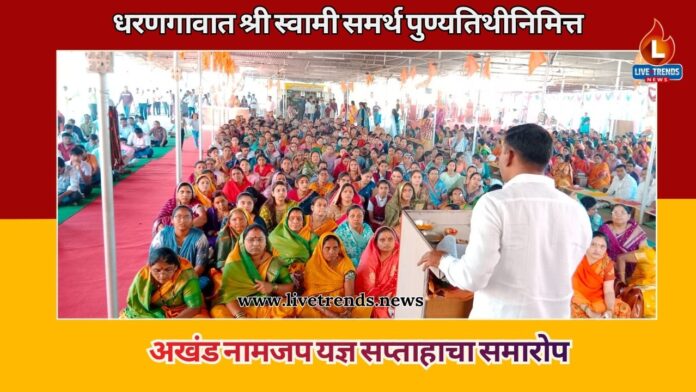 धरणगाव-लाईव्ह ट्रेंड्स न्यूज प्रतिनिधी । श्री स्वामी समर्थ महाराज यांच्या पुण्यतिथीनिमित्त धरणगाव येथे आयोजित अखंड नाम-जप यज्ञ सप्ताहाचा सांगता सोहळा १५ एप्रिल रोजी अत्यंत भक्तिमय आणि उत्साहपूर्ण वातावरणात पार पडला. सात दिवस चाललेल्या या आध्यात्मिक सोहळ्याने संपूर्ण शहरात श्रद्धा, भक्ती आणि अध्यात्मिक उर्जेची अनुभूती निर्माण केली असून भाविकांचा उत्स्फूर्त प्रतिसाद लाभला.