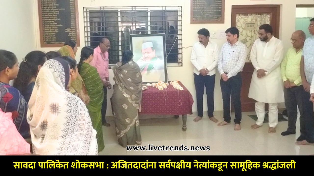 सावदा-लाईव्ह ट्रेंडस न्यूज प्रतिनिधी । उपमुख्यमंत्री अजितदादा पवार यांच्या निधना झाल्याने आज सावदा नगरपालिकेत सर्वपक्षीय लोकप्रतिनिधी आणि कर्मचाऱ्यांच्या वतीने दादांच्या प्रतिमेला माल्यार्पण करून सामूहिक भावपूर्ण श्रद्धांजली अर्पण करण्यात आली.