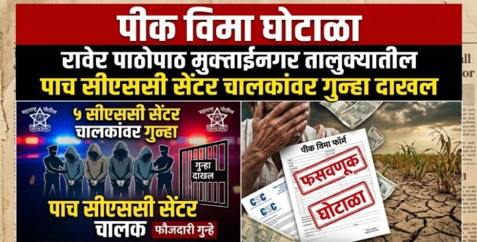 जळगाव जिल्ह्यात सीएससी सेंटर चालकांनी काही जणांशी संगनमत करून पीक विम्यात मोठा डल्ला मारल्याचे दिसून येत आहे. या प्रकरणी काल रावेर तालुक्यातील चार सीएससी चालकांवर गुन्हा दाखल करण्यात आला होता. आता या पाठोपाठ मुक्ताईनगर तालुक्यात देखील मोठी कारवाई करण्यात आली आहे. यात मंडळ कृषी अधिकारी प्रथमेश थोरात यांनी मुक्ताईनगर पोलीस स्थानकात फिर्याद दिली. यानुसार, पाच सीएससी चालकांच्या विरोधात गुन्हा दाखल करण्यात आला आहे.