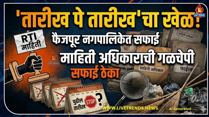 फैजपूर – लाईव्ह ट्रेंड्स न्यूज प्रतिनिधी । शहरातील स्वच्छता अभियानाच्या नावाखाली सुरू असलेल्या सफाई ठेक्यांच्या कारभारावर सध्या संशयाचे ढग गडद झाले असून, यातील ‘काळेबेरे’ उघड होऊ नयेत यासाठी प्रशासन माहिती अधिकाराचाच गळा घोटत असल्याचे धक्कादायक चित्र समोर आले आहे. माहिती अधिकाराच्या अंतर्गत मागितलेल्या माहितीवर सुनावणी घेण्यासाठी टाळाटाळ केली जात असून, प्रशासनाकडून सुरू असलेल्या ‘तारीख पे तारीख’च्या खेळामुळे भ्रष्टाचाराला पाठीशी घालण्याचा प्रयत्न होतोय का, असा गंभीर सवाल आता उपस्थित केला जात आहे.
