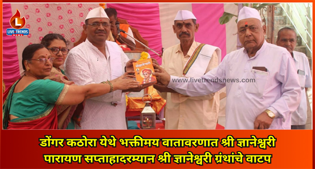 यावल-लाईव्ह ट्रेंडस न्यूज प्रतिनिधी | यावल तालुक्यातील डोंगर कठोरा येथे वै.ह.भ.प.झेंडुजी महाराज बेळीकर,कै.गुरुवर्य जगन्नाथ महाराज व कै.सद्गुरू नारायण महाराज यांच्या कृपेने तसेच श्री.विठ्ठल मंदिर पंचवटी डोंगर कठोरा यांच्या वतीने २२ फेब्रुवारी ते २९ फेब्रुवारी २४ दरम्यान श्री. ज्ञानेश्वरी पारायण सप्ताहाचे आयोजन करण्यात आलेले आहे.सदरहू काल दि.२२ फेब्रुवारी गुरुवार रोजी सदरील श्री.ज्ञानेश्वरी पारायण सप्ताहाची सुरुवात श्री. ज्ञानेश्वरी ग्रंथांचे वाटप करून मोठ्या उत्साहात करण्यात आली.