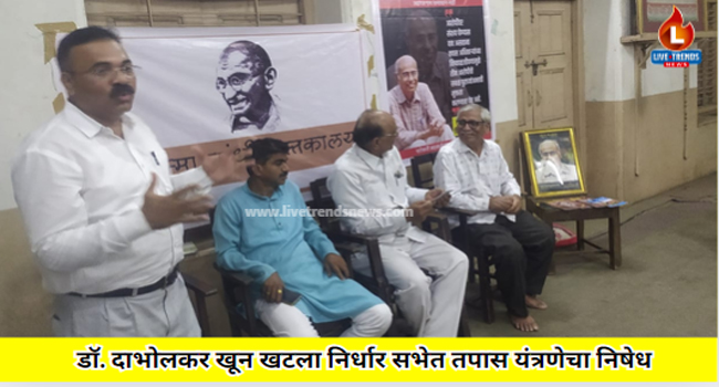 जळगाव-लाईव्ह ट्रेंड्स न्युज प्रतिनिधी । शहीद डॉ. नरेंद्र दाभोलकर यांच्या खुनाच्या खटल्याच्या निकालासंदर्भाच्या पार्श्वभूमीवर महात्मा गांधी सार्वजनिक वाचनालयाच्या सहकार्याने व महाराष्ट्र अंधश्रद्धा निर्मूलन समितीच्या जळगाव शहर शाखेच्या वतीने तसेच समविचारी संस्था संघटनेच्या सहभागाने शुक्रवार १७ मे रोजी संध्याकाळी निर्धार सभा घेण्यात आली. सभेत, निकालाबाबत असमाधान व्यक्त करत, आलेल्या निकालाचे विश्लेषण मान्यवरांनी केले. तसेच यापुढेही हिंसा मुक्त समाज निर्मितीसाठी सातत्याने प्रयत्न करण्याचा निर्धार करण्यात आला.