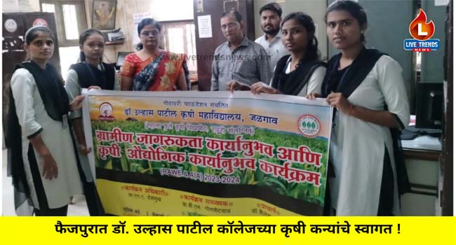 फैजपूर, ता. यावल-लाईव्ह ट्रेंडस न्यूज प्रतिनिधी | डॉॅ. उल्हास पाटील कृषी महाविद्यालयातील विद्यार्थीने फैजपुर शिवारात प्रॅक्टीकल अध्ययन करणार असून या विद्यार्थीनींचे जोरदार स्वागत करण्यात आले.