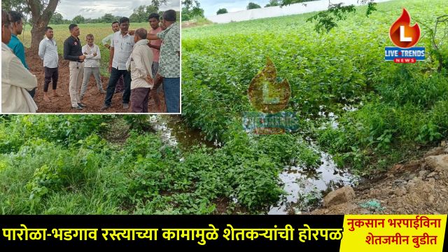पारोळा – लाईव्ह ट्रेंड्स न्यूज प्रतिनिधी ।  पारोळा ते भडगाव रस्त्याच्या विस्तारीकरणाचे काम सध्या जोमाने सुरू आहे. मात्र या विकासकामामुळे आजूबाजूच्या शेतकऱ्यांना मोठ्या आर्थिक नुकसानीला सामोरे जावे लागत आहे. पावसाळ्याच्या काळात रस्त्याच्या दोन्ही बाजूंच्या गटाऱ्या बंद केल्यामुळे पाणी थेट शेतामध्ये साचून कापूस व भाजीपाला पिकाचे प्रचंड नुकसान झाले आहे. या पार्श्वभूमीवर महाराष्ट्र शेतकरी संघटनेचे संस्थापक व शेतकरी नेते सुनील देवरे यांनी चोरवड शिवारात भेट देत शेतकऱ्यांच्या समस्यांवर थेट निरीक्षण करत संतप्त प्रतिक्रिया व्यक्त केली.