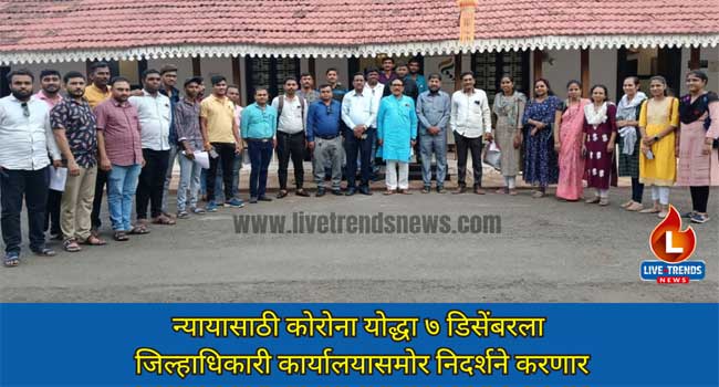जळगाव-लाईव्ह ट्रेंडस न्यूज प्रतिनिधी | शासनाकडे सातत्याने न्याय मागण्यासाठी पाठपुरावा केला असतानाही शासन दुर्लक्ष करीत असल्याने कोरोना योद्ध्यांनी तीव्र आंदोलन छेडण्याचा निर्णय घेतला आहे. आंदोलनाची पहिल्या टप्यात गुरुवार दिनांक ७ डिसेंबर २०२३ रोजी जिल्हाधिकारी कार्यालयासमोर निदर्शने करण्यात येणार आहे.