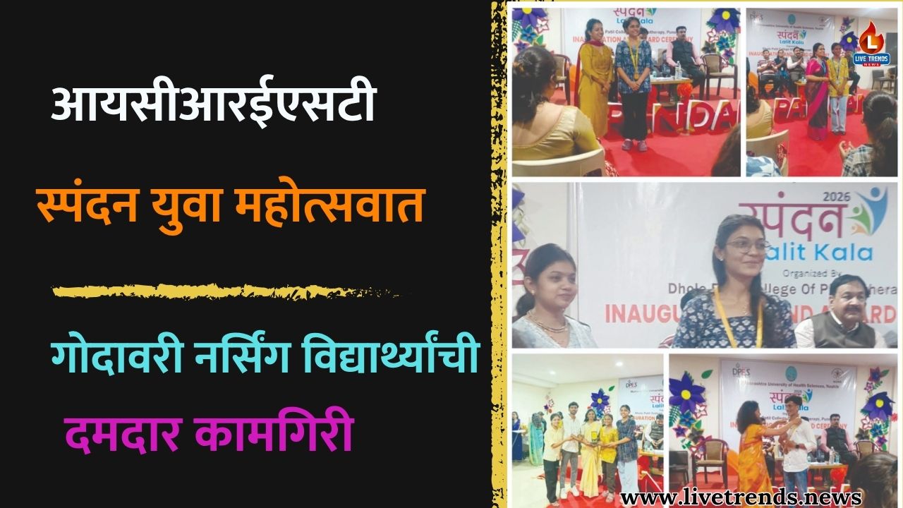 जळगाव-लाईव्ह ट्रेंड्स न्यूज प्रतिनिधी ।  महाराष्ट्र आरोग्य विज्ञान विद्यापीठ, नाशिक आयोजित राज्यस्तरीय सांस्कृतिक युवा महोत्सव ‘स्पंदन २०२६’मध्ये गोदावरी कॉलेज ऑफ नर्सिंग, जळगावच्या विद्यार्थ्यांनी विविध स्पर्धांमध्ये दमदार कामगिरी करत महाविद्यालयाच्या शिरपेचात मानाचा तुरा रोवला आहे. कला, सर्जनशीलता आणि सांस्कृतिक कौशल्याच्या विविध स्पर्धांमध्ये विद्यार्थ्यांनी पटकावलेल्या यशामुळे संस्थेचा गौरव उंचावला आहे.