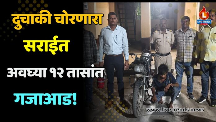 जळगाव-लाईव्ह ट्रेंडस न्यूज प्रतिनिधी । जळगाव शहरातील एम.आय.डी.सी. परिसरातून दुचाकी चोरी करणाऱ्या एका सराईत गुन्हेगाराला पोलिसांनी अवघ्या १२ तासांच्या आत अटक केली आहे. साहिल महोमद तडवी (वय २८, रा. मच्छीबाजार, तांबापुरा) असे अटक करण्यात आलेल्या आरोपीचे नाव असून, त्याच्याकडून चोरीला गेलेली दुचाकी देखील जप्त करण्यात आली आहे.