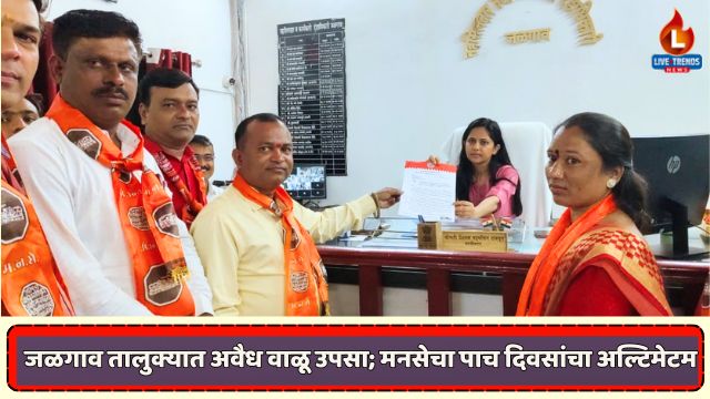 जळगाव-लाईव्ह ट्रेंडस न्यूज प्रतिनिधी । जळगाव तालुक्यात बेकायदेशीरपणे सुरू असलेला वाळू आणि मुरुमाचा उपसा व वाहतूक तात्काळ थांबवावी, या मागणीसाठी महाराष्ट्र नवनिर्माण सेनेने आक्रमक भूमिका घेतली आहे. मंगळवारी, २३ सप्टेंबर रोजी दुपारी १२ वाजता मनसेच्या शिष्टमंडळाने तहसीलदार शीतल राजपूत यांना निवेदन देऊन पुढील पाच दिवसांत कारवाई न झाल्यास तीव्र आंदोलन करण्याचा इशारा दिला आहे.