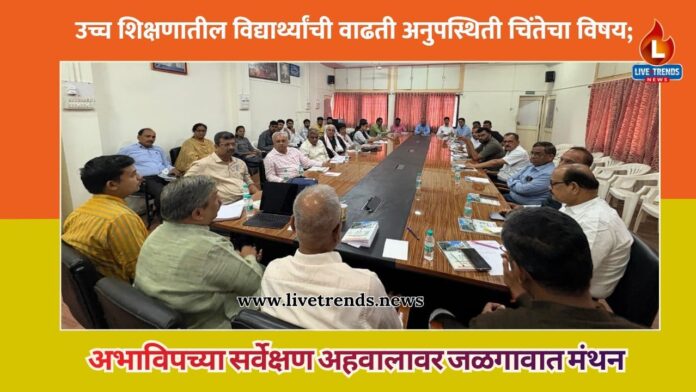 जळगाव-लाईव्ह ट्रेंड्स न्यूज प्रतिनिधी । उच्च शिक्षण क्षेत्रात विद्यार्थ्यांची वाढती अनुपस्थिती ही गंभीर सामाजिक आणि शैक्षणिक समस्या बनत असून या पार्श्वभूमीवर अखिल भारतीय विद्यार्थी परिषद (अभाविप), देवगिरी प्रदेशाच्या वतीने जळगावात महत्त्वपूर्ण चर्चासत्राचे आयोजन करण्यात आले. मराठवाडा आणि खान्देश स्तरावर करण्यात आलेल्या शास्त्रशुद्ध सर्वेक्षण अहवालाच्या आधारे विद्यार्थ्यांच्या घटत्या उपस्थितीमागील कारणांचा वेध घेत शिक्षण व्यवस्थेत मूलभूत बदलांची गरज अधोरेखित करण्यात आली.