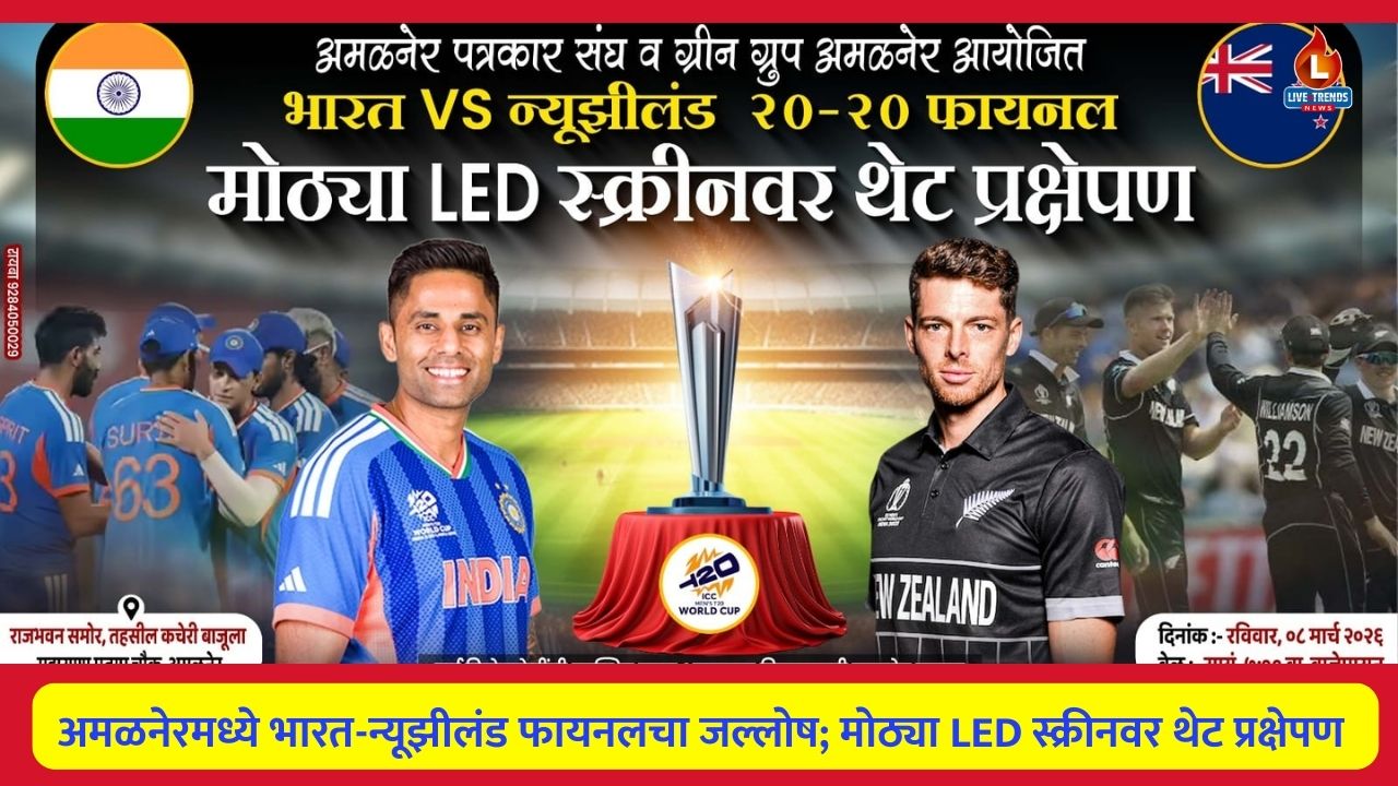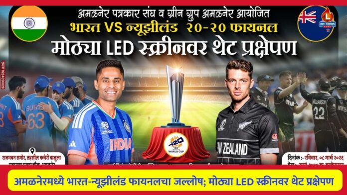 अमळनेर-लाईव्ह ट्रेंड्स न्यूज प्रतिनिधी ।  भारत आणि न्यूझीलंड यांच्यात रविवारी होणाऱ्या T20 अंतिम सामन्याच्या पार्श्वभूमीवर अमळनेर शहरातील क्रिकेटप्रेमींसाठी मोठी आनंदाची बातमी आहे. या रोमांचक लढतीचा थरार एकत्रितपणे अनुभवता यावा यासाठी ग्रीन ग्रुप, अमळनेर तसेच अमळनेर शहर व तालुका पत्रकार संघ यांच्या संयुक्त विद्यमाने शहरात मोठ्या LED स्क्रीनवर सामन्याचे थेट प्रक्षेपण करण्यात येणार आहे. त्यामुळे शहरातील क्रीडारसिकांना सामूहिकरीत्या अंतिम सामन्याचा आनंद घेण्याची संधी मिळणार आहे.