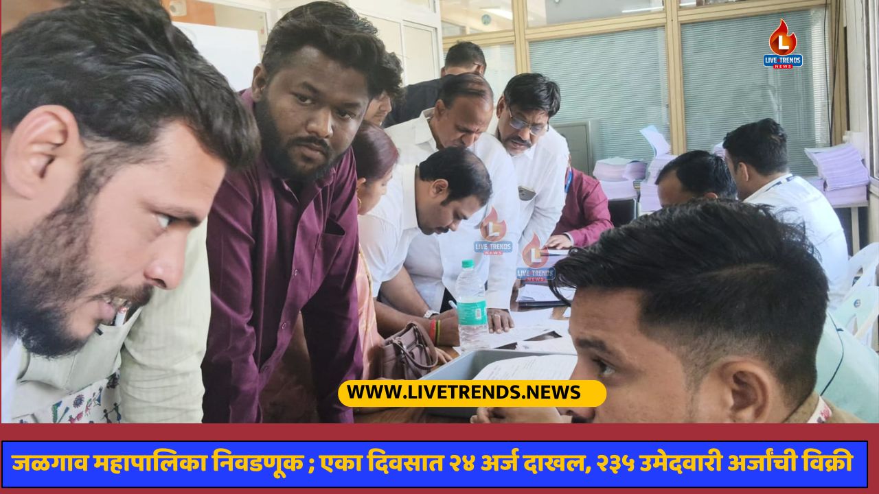 जळगाव-लाईव्ह ट्रेंड्स न्यूज प्रतिनिधी । जळगाव महापालिका निवडणुकीच्या प्रक्रियेत दिवसेंदिवस गती येत असून आज शनिवारी उमेदवारी अर्ज दाखल करण्याच्या टप्प्यात लक्षणीय हालचाल पाहायला मिळाली. आजच्या एकाच दिवशी तब्बल २४ उमेदवारी अर्ज दाखल झाले असून २३५ इच्छुक उमेदवारांनी अर्जांची खरेदी केल्याने महापालिका निवडणुकीची रंगत वाढत चालली आहे.