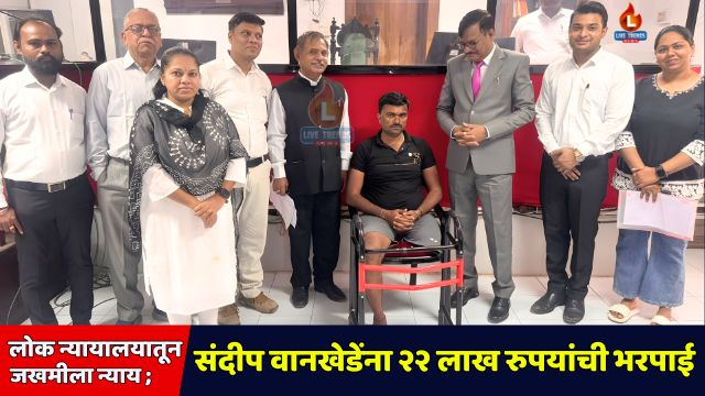 जळगाव-लाईव्ह ट्रेंड्स न्यूज प्रतिनिधी । रस्ता अपघातात कायमस्वरूपी अपंगत्व आलेल्या जखमीला न्याय मिळवून देण्यात लोक न्यायालयाची भूमिका पुन्हा एकदा अधोरेखित झाली असून, जळगाव जिल्ह्यातील शिरूड (ता. अमळनेर) येथील संदीप नारायण वानखेडे यांना लोक अदालतीच्या माध्यमातून तब्बल २२ लाख रुपयांची नुकसान भरपाई मंजूर करण्यात आली आहे. दीड वर्षांच्या आत निकाल लागल्याने जखमी व त्यांच्या कुटुंबाला मोठा दिलासा मिळाला आहे.
