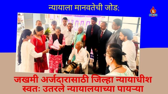 जळगाव-लाईव्ह ट्रेंड्स न्यूज प्रतिनिधी । जळगाव जिल्हा व सत्र न्यायालयात आयोजित राष्ट्रीय लोक अदालतीदरम्यान न्यायाला मानवतेची जोड देणारी एक हृदयस्पर्शी घटना घडली. गंभीर अपघातात जखमी होऊन चार वर्षांपासून अंथरुणाला खिळलेल्या अर्जदाराची प्रत्यक्ष पडताळणी करण्यासाठी न्यायालयातील न्यायाधीश स्वतः न्यायालयाच्या पायऱ्या उतरून वाहनतळात पोहोचले. या घटनेमुळे न्यायप्रक्रियेत मानवी संवेदनांचा सुंदर प्रत्यय पाहायला मिळाला.