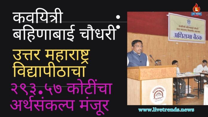 जळगाव- -लाईव्ह ट्रेंड्स न्यूज प्रतिनिधी । कवयित्री बहिणाबाई चौधरी उत्तर महाराष्ट्र विद्यापीठाच्या सन २०२६-२७ या आर्थिक वर्षासाठीचा २९३.५७ कोटी रुपयांचा अर्थसंकल्प शनिवारी (१४ मार्च) आयोजित अधिसभेच्या बैठकीत एकमताने मंजूर करण्यात आला. कुलगुरू प्रा. व्ही. एल. माहेश्वरी यांच्या अध्यक्षतेखाली झालेल्या या बैठकीत व्यवस्थापन परिषद सदस्य नितीन झाल्टे यांनी हा अर्थसंकल्प सादर केला. यंदाच्या अर्थसंकल्पात १५.४४ कोटी रुपयांची तूट दर्शविण्यात आली असून, मागील वर्षाच्या तुलनेत या तुटीत २.४३ कोटी रुपयांची घट झाली आहे. अनावश्यक खर्च कमी करून शैक्षणिक आणि रचनात्मक विकासावर भर देणारे हे अंदाजपत्रक असल्याचे यावेळी स्पष्ट करण्यात आले.