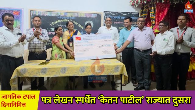 जळगाव-लाईव्ह ट्रेंड्स न्यूज प्रतिनिधी । ९ ऑक्टोबर जागतिक टपाल दिनाच्या निमित्ताने टपाल विभागातर्फे आयोजित करण्यात आलेल्या आंतरराष्ट्रीय पत्र लेखन स्पर्धेत, येथील झांबरे विद्यालयाच्या आठवीतील विद्यार्थी केतन गिरीश पाटील याने राज्यात दुसरा क्रमांक पटकावत एक मोठा मानाचा टप्पा गाठला. ‘समुद्र’ या विषयावर झालेल्या या स्पर्धेत केतनच्या विचारमांडणीने आणि लेखनशैलीने राज्यभरातील विद्यार्थ्यांमध्ये आपली वेगळी छाप पाडली. या यशाबद्दल टपाल विभागाकडून केतनचा शाळेमध्ये विशेष सन्मान करण्यात आला.