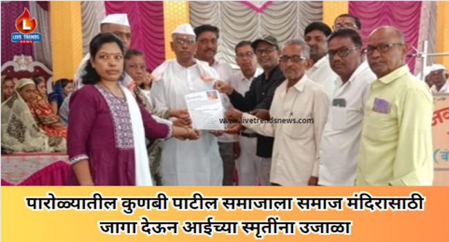 पारोळा-लाईव्ह ट्रेंडस न्यूज प्रतिनिधी | सूर्यवंशी परिवाराची सामाजिक बांधिलकी संत तुकाराम महाराज बहुउद्देशीय मंडळ समस्त कुणबी पाटील समाजाच्या समाज मंगल कार्यालय करिता ओपन स्पेस लगत असलेल्या १००० स्क्वेअर फुट प्लॉट एरिया कै. हिरकणबाई वसंत पाटील यांच्या स्मरणार्थ सूर्यवंशी परिवाराने देऊ केली असूनआईच्या स्मृतींना त्यांनी कायमस्वरूपी उजाळा दिला आहे. त्यांच्या या सामाजिक बांधिलकीचेसमस्त कुणबी पाटील समाजासहशहरवासी यांनी कौतुक केले. सामाजिक कार्यात अग्रेसर असलेल्या कै. हिरकणबाई वसंत पाटील यांचे नुकतेच अल्पशा आजाराने निधन झाले.