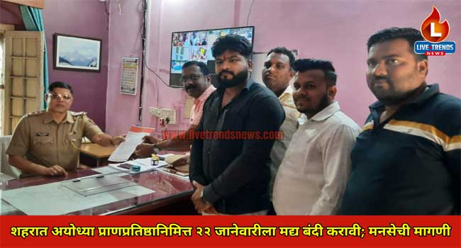यावल-लाईव्ह ट्रेंडस न्यूज प्रतिनिधी | श्रीराम मंदिर स्थापनाच्या निमित्ताने शहरात येत्या २२ जानेवारी रोजी भव्य शोभायात्रा काढण्यात येणार आहे. या पार्श्वभुमीवर कायदा सुव्यवस्थेचा प्रश्न उपस्थित होऊ नये, या दृष्टीने स्थानिक पोलीस प्रशासनाने शहरात विक्री होणाऱ्या दारू विक्री बंद करावी अशी मागणी महाराष्ट्र नवनिर्माण सेनेच्या वतीने एका निवेदनाद्वारे करण्यात आली आहे.