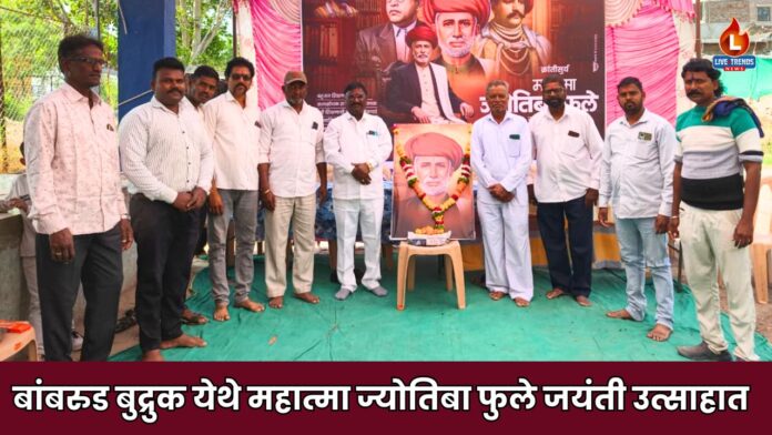 भडगाव-लाईव्ह ट्रेंड्स न्यूज प्रतिनिधी । बांबरुड बुद्रुक येथे राष्ट्रपिता महात्मा ज्योतिबा फुले यांची जयंती मोठ्या उत्साहात व सामाजिक बांधिलकीच्या भावनेत साजरी करण्यात आली. महामानव डॉक्टर बाबासाहेब आंबेडकर बहुउद्देशीय संस्था भडगाव व भीम जयंती महोत्सव समिती बांबरुड बुद्रुक यांच्या संयुक्त विद्यमाने या कार्यक्रमाचे आयोजन करण्यात आले होते. कार्यक्रमामुळे गावात सामाजिक समतेचा व शिक्षणाचा संदेश पुन्हा एकदा दृढ झाला.