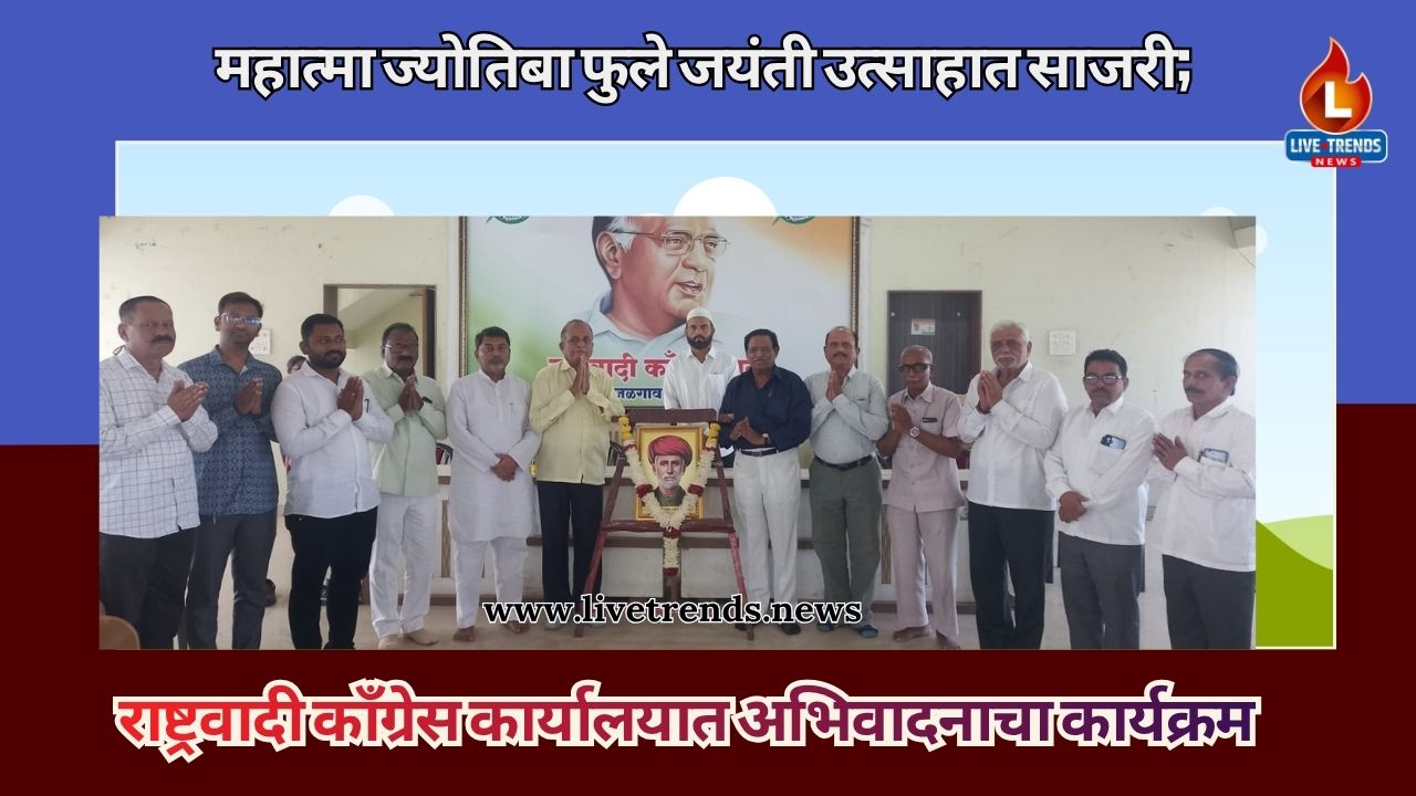 जळगाव-लाईव्ह ट्रेंड्स न्यूज प्रतिनिधी । थोर समाजसुधारक आणि क्रांतिकारक महात्मा ज्योतिराव फुले यांच्या जयंतीनिमित्त आज जिल्हा राष्ट्रवादी काँग्रेस (शरदचंद्र पवार) पक्षाच्या कार्यालयात अभिवादनाचा कार्यक्रम उत्साहात पार पडला. समाजप्रबोधन, शिक्षण आणि समतेचा संदेश देणाऱ्या फुले यांच्या कार्याची आठवण यावेळी उपस्थितांनी कृतज्ञतेने केली.