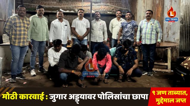 जळगाव लाईव्ह ट्रेंड्स न्यूज प्रतिनिधी | रामानंद नगर पोलीस ठाण्याच्या हद्दीतील हरीविठ्ठल नगर येथे सुरू असलेल्या एका जुगार अड्ड्यावर स्थानिक गुन्हे शाखेच्या पथकाने शुक्रवारी आठ ऑगस्ट रोजी रात्री १० वाजता छापा टाकत ९ आरोपींना ताब्यात घेतले. या कारवाईत पोलिसांनी रोख रक्कम, मोबाईल आणि मोटरसायकल असा एकूण ३ लाख १४ हजार ३४० रुपयांचा मुद्देमाल जप्त केला आहे. याबाबत रामानंदनगर पोलीस ठाण्यात गुन्हा दाखल करण्यात आला आहे.
